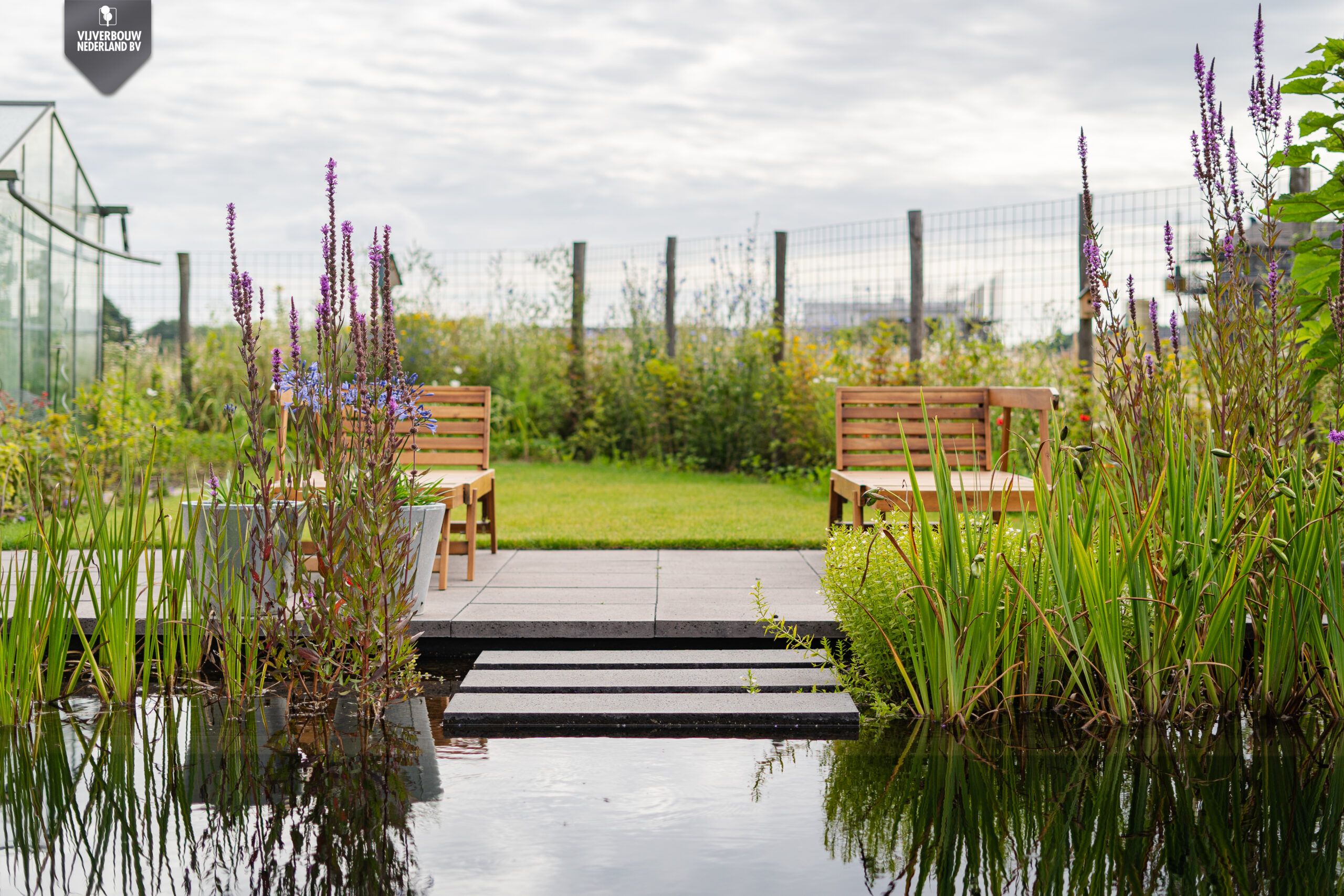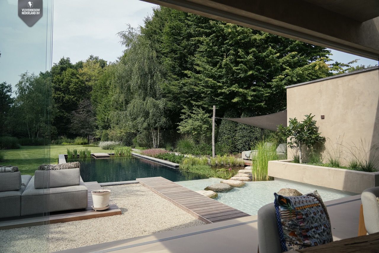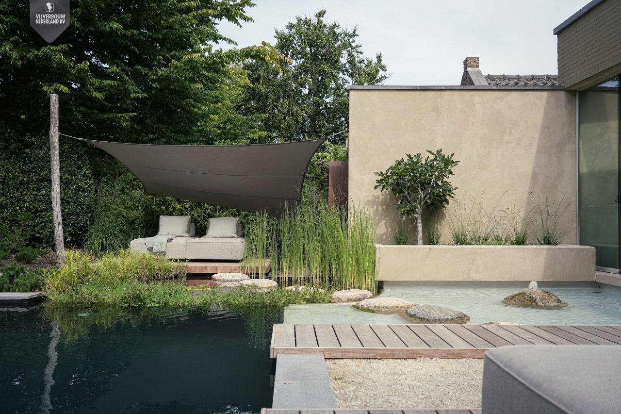 De zithoek, subtiel beschut onder een schaduwdoek, nodigt uit om te ontspannen en te genieten van de omgeving. De zorgvuldig geplaatste stapstenen leiden je over het water naar het comfortabele ligbed, waardoor de overgang tussen terras en vijver op een speelse manier wordt beleefd.